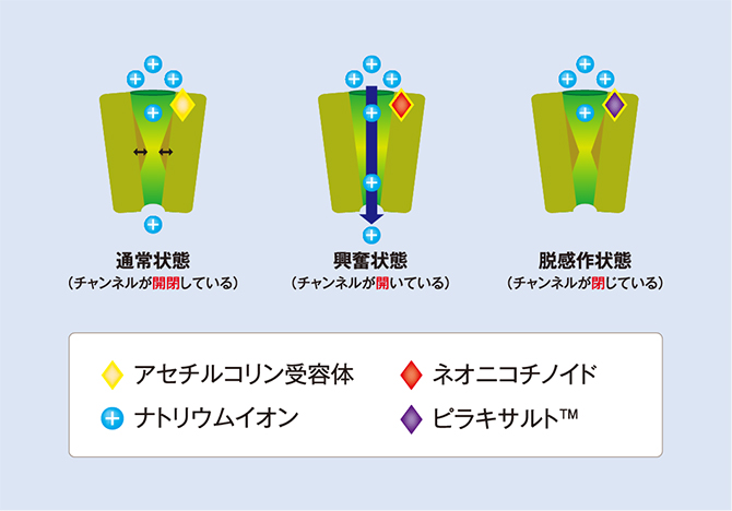 グループ4の殺虫剤は害虫の神経伝達物質・アセチルコリンの受容体であるニコチン性アセチルコリン受容体(nAChR)に作用しますが、サブグループにより作用性は異なります。害虫は正常状態では神経伝達チャンネルを開閉しイオンを適量透過させることで神経伝達を行っています。グループ4Aのネオニコチノイド系殺虫剤は受容体チャンネルを開いた状態でロックし異常興奮を引き起こすのに対して、グループ4Eのピラキサルト™は受容体チャンネルを閉じた状態でロックし脱感作(昏睡)状態を引き起こします。