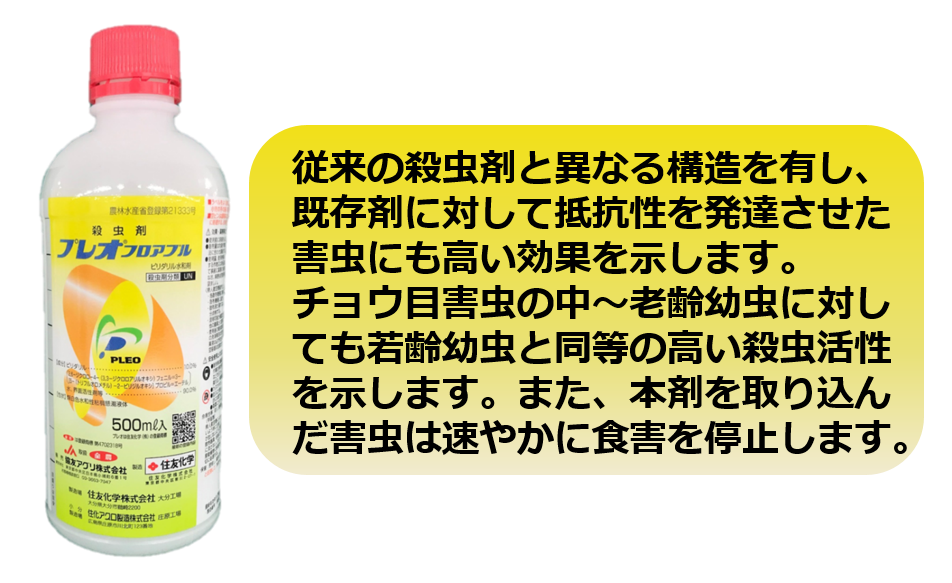 - 食入後は殺虫剤がかかり難く、また幼虫の生育が進むと薬剤が効きにくくなるため、発生初期の防除が特に大切です。