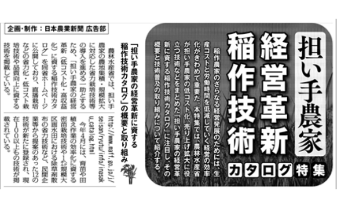 「担い手農家の経営革新に資する稲作技術カタログ」(農林水産省)にピラクロニル含有一発処理ジャンボ剤を用いた技術:「1ha規模大区画水田における除草剤散布の省力技術」が新規登録(2017年5月発行)