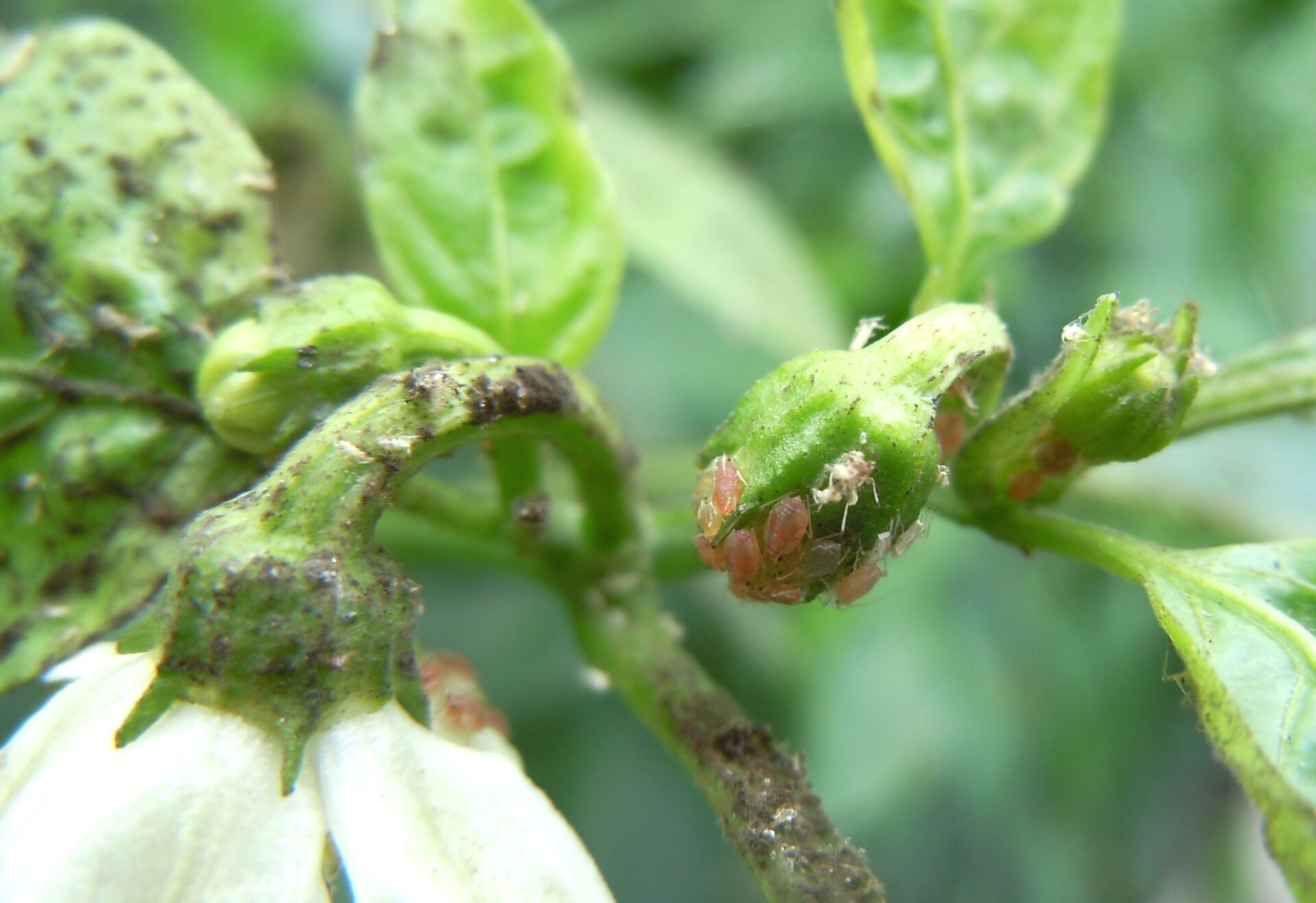 ピーマンの実にモモアカアブラムシが群がる様子