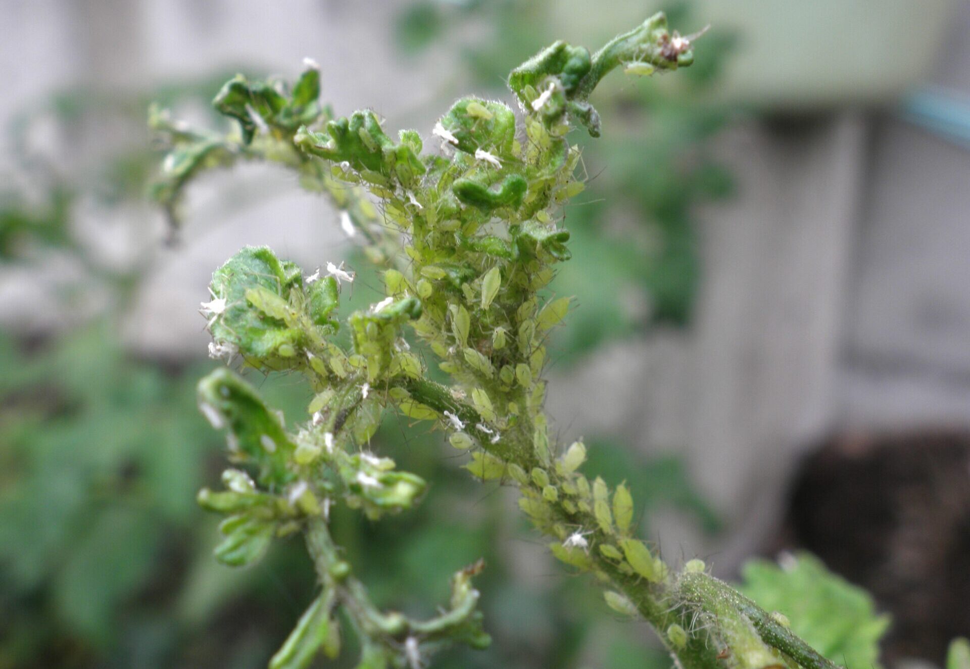 葉裏や葉柄の吸汁による被害のほか、新芽に寄生すると葉を巻いたり萎縮して生育に影響を与えます。