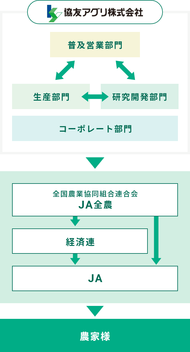 製造した農薬は、全国農業協同組合連合会(全農)から、国内各地のJA組織を経由して農業者にお届けしています。