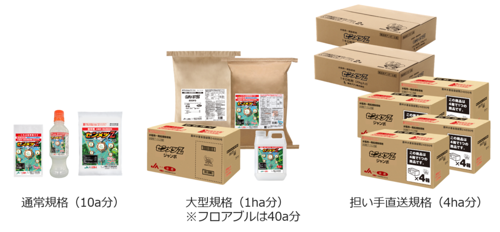 1キロ粒剤、フロアブル、ジャンボ、200FGの4つの剤型があり、使い勝手の良い除草剤です。